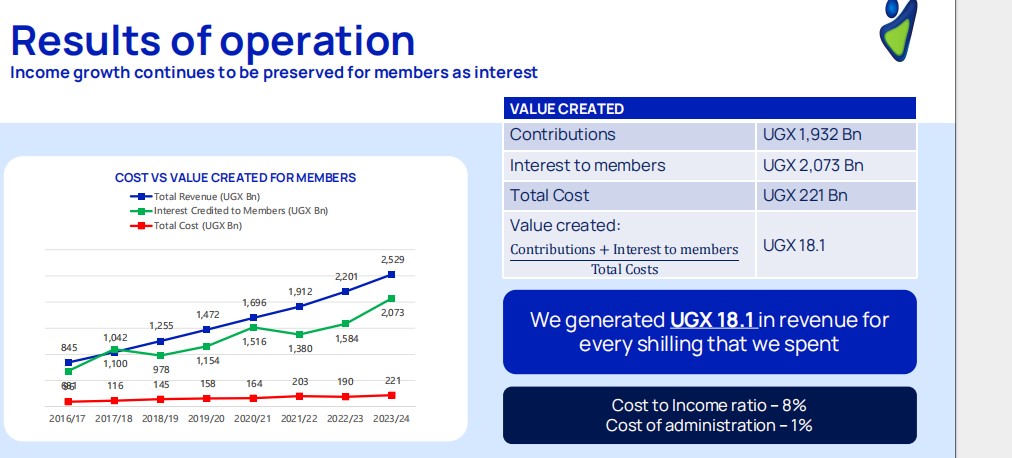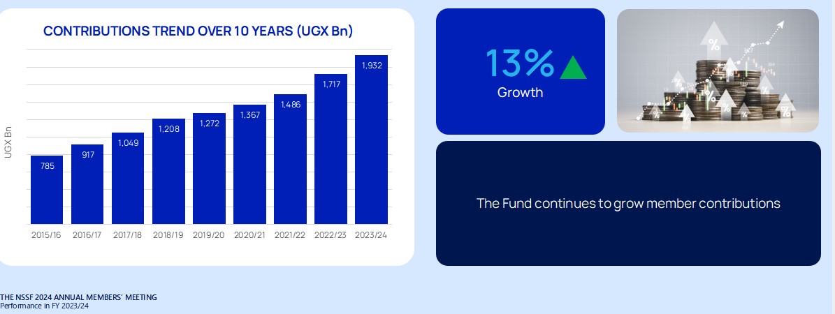 NSSF saw a robust growth in contributions from UGX 1.72 trillion in 2022/3 to UGX 1.93 trillion 2023/, and will pay over UGX 2 trillion in interest to over 2.3 million registered members.