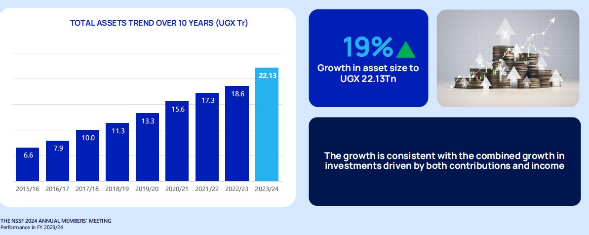 NSSF total assets grew from UGX 6.6 billion in 2015 to UGX 22.13 billion in 2024.