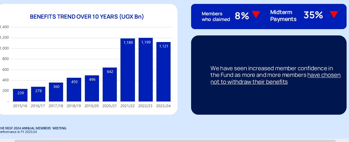 NSSF benefits clocked UGX 1.12 trillion in the FY 2023/2024 from UGX 239 billion in FY2015/16