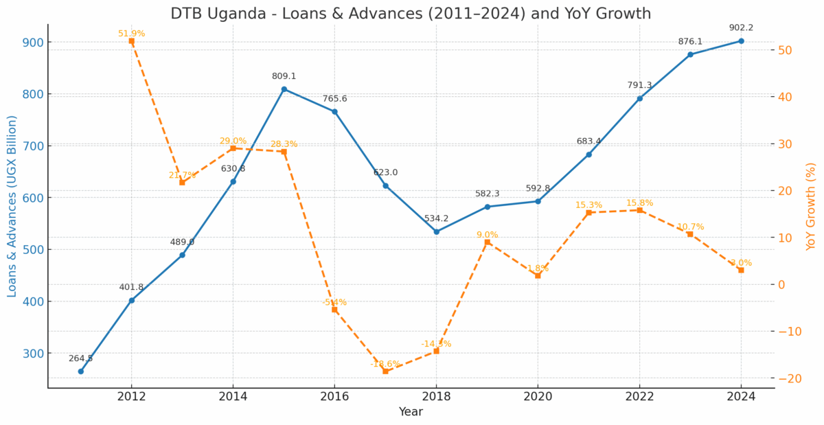 DTB Uganda’s loans and advances also grew modestly by 3.0% in 2024, rising from UGX 876.1 billion in 2023 to UGX 902.2 billion. While this increase represents continued expansion of the bank’s credit portfolio, it falls short of the bank’s historical growth trend. Between 2011 and 2023, DTB Uganda had grown its loan book at an estimated Compound Annual Growth Rate (CAGR) of 10.5%, nearly triple the 2024 rate. The decade-long average had seen the bank’s loans and advances rise from approximately UGX 264.5 billion in 2011 to UGX 876.1 billion by 2023, fueled by consistent deposit growth and an aggressive push into the SME and retail markets.