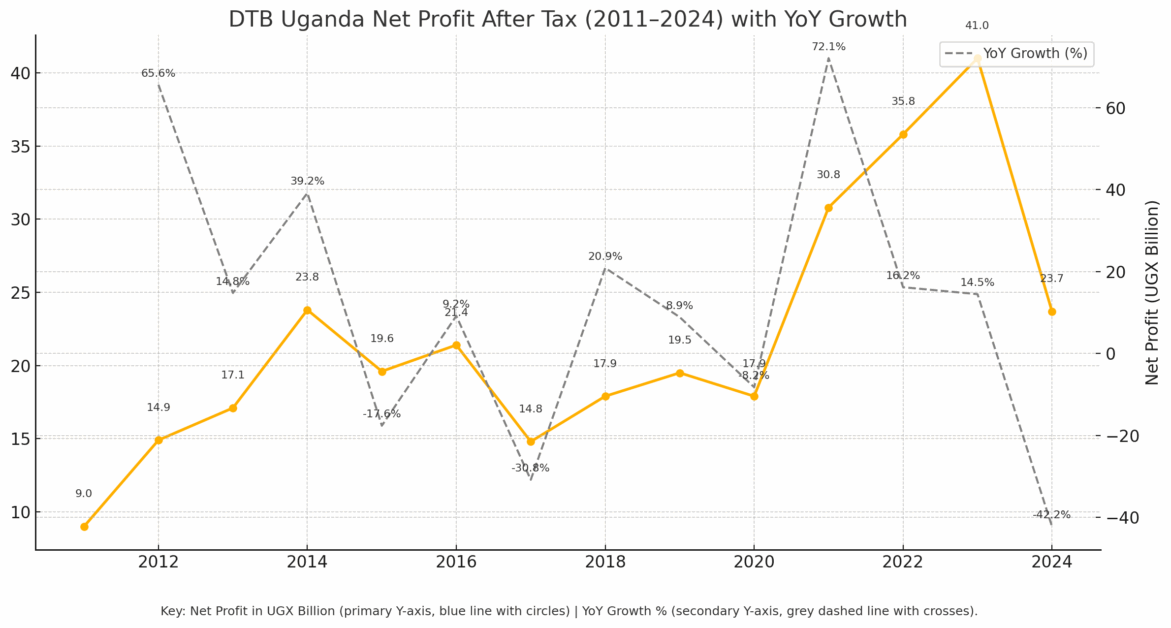 DTB Uganda’s profitability declined sharply in 2024, marking a significant departure from the consistent growth the bank had recorded over the past decade. Net profit after tax fell by 42.2%, dropping from UGX 41.0 billion in 2023 to UGX 23.7 billion in 2024. This decline reflects the combined impact of higher operating expenses, increased loan loss provisions, and a weakened balance sheet, as the bank’s customer deposits and total assets contracted during the year.