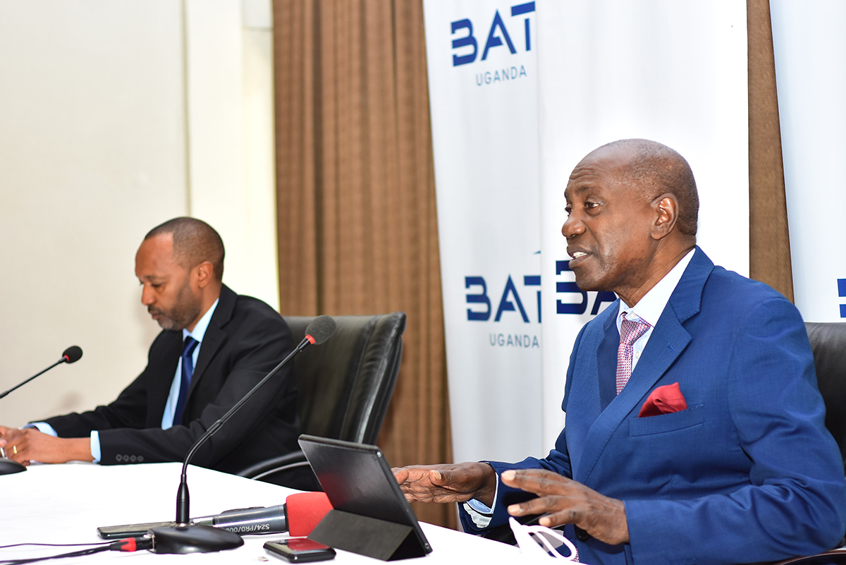 BAT Uganda Chairman, Hon Dr Elly Karuhanga (right) with the company's Managing Director, Mathu Kiunjuri, at the company's press conference held on Tuesday, June 28, 2022, in Kampala
