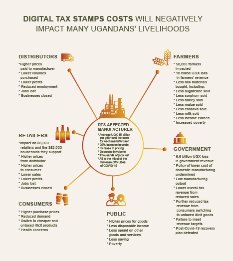 “All our efforts to obtain reassurance from the Government that it will cover the DTS costs beyond 30 June 2020, have so far proved futile. We have been left with no other alternative but to request your help. If the industry has to pay for tax stamps, the livelihoods of farmers, retailers, distributors, and the public will all be drastically affected. The situation is even more pressing as a result of the Covid-19 pandemic which has severely impacted the operations and extensive supply chains of the very industries that will be affected by the imposition of DTS costs, “the manufacturers say in their petition to President Museveni.