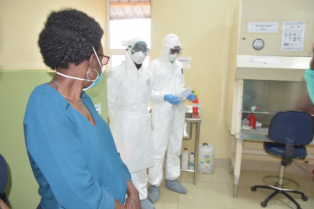 The Minister of Health, Dr Jane Ruth Aceng (left) at the 19th May 2020 launch of the Port Health COVID-19 laboratory at the main Uganda-Tanzania border point at Mutukula border. The laboratory equipment includes two GeneXpert machines capable of processing 64 COVID-19 samples per hour.