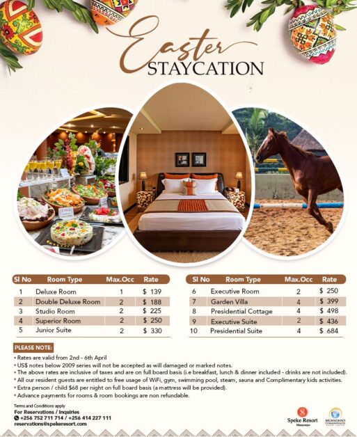 At the heart of the Easter offering is the resort’s staycation package, designed for families and couples seeking a relaxing escape without leaving Kampala.
