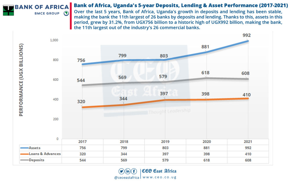 Bank of Africa’s assets, between 2017 and 2021, also grew by 31.2%, from UGX756 billion to a historic high of UGX992 billion, making the bank, the 11th largest out of the industry’s twenty-six commercial banks.