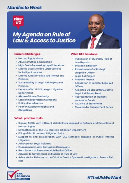 In conclusion, this manifesto is a roadmap towards a more empowered, professional, and inclusive Uganda Law Society. I believe that through collaboration, transparency, and innovation, we can achieve these goals and uplift both the profession and society at large. Together, we can continue to defend the rule of law, serve our members, and build a more just society.