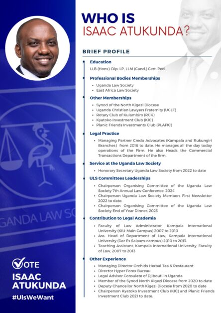As I seek the honour of leading the Uganda Law Society, I am driven by a vision to strengthen the rule of law, empower our members, and ensure that our institution continues to play a pivotal role in the legal landscape. My candidacy is centred around delivering practical solutions to the challenges we face while building on the successes we have achieved thus far. This manifesto outlines my vision for a more inclusive, dynamic, and accountable Uganda Law Society.