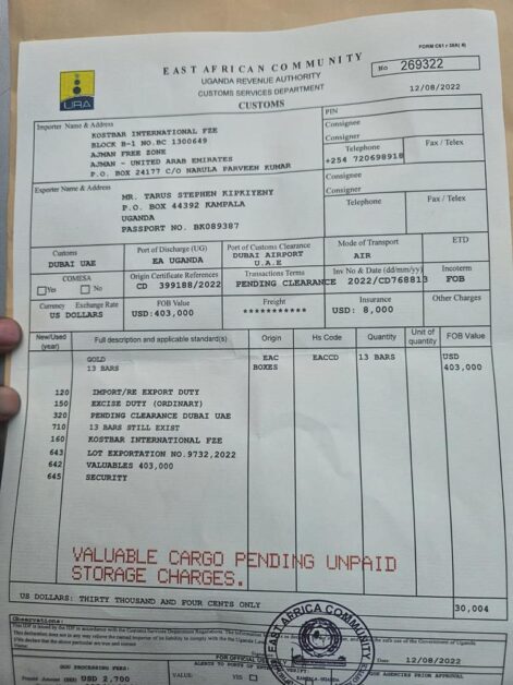 According to the Uganda Police charge sheet, Mr Kipkiyeny and others still at large, in or about January 2024 falsified URA customs export documents with receipt no. 872 dated 6th of January, 2024; invoice number CNO/16- 496/3 dated 5th of January 2024 and a bill of lading number 269322 dated 12th of August 2022.