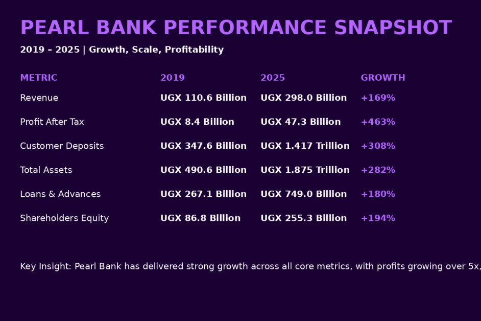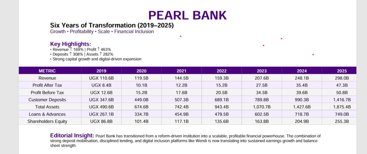 Pearl Bank Uganda closed 2025 with strong earnings and balance-sheet expansion, posting profit after tax of UGX 47.3 billion, up from UGX 35.4 billion a year earlier, as total income climbed to UGX 298.0 billion and the bank deepened its funding base through a sharp rise in customer deposits.