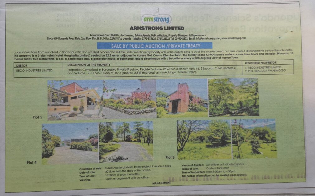 One of Kasese’s most prominent hospitality assets, Hotel Margherita, is on a countdown to the auctioneer’s hammer after a debt recovery process was initiated by a financial institution against Reco Industries Limited. A public notice issued by Armstrong Limited, a firm of court bailiffs and auctioneers, indicates that the property will be sold by public auction or private treaty within 30 days of the notice unless the outstanding debt, together with accrued interest, fees, and related costs, is fully settled.