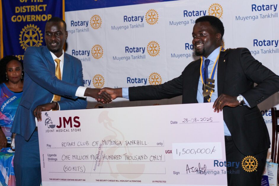 Rubango, representing Rotary, hands over a dummy cheque worth Ugx1.5m to JMS in preparation for the cancer run.