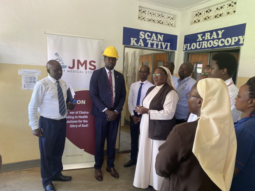 Kenneth Rubango (with helmet), the Director of Biomedical Engineering at Joint Medical Stores (JMS), and other officials receive the imaging ward at Naggalama Hospital to renovate it in line with Atomic Imaging Council requirements before the installation of the CT scan.