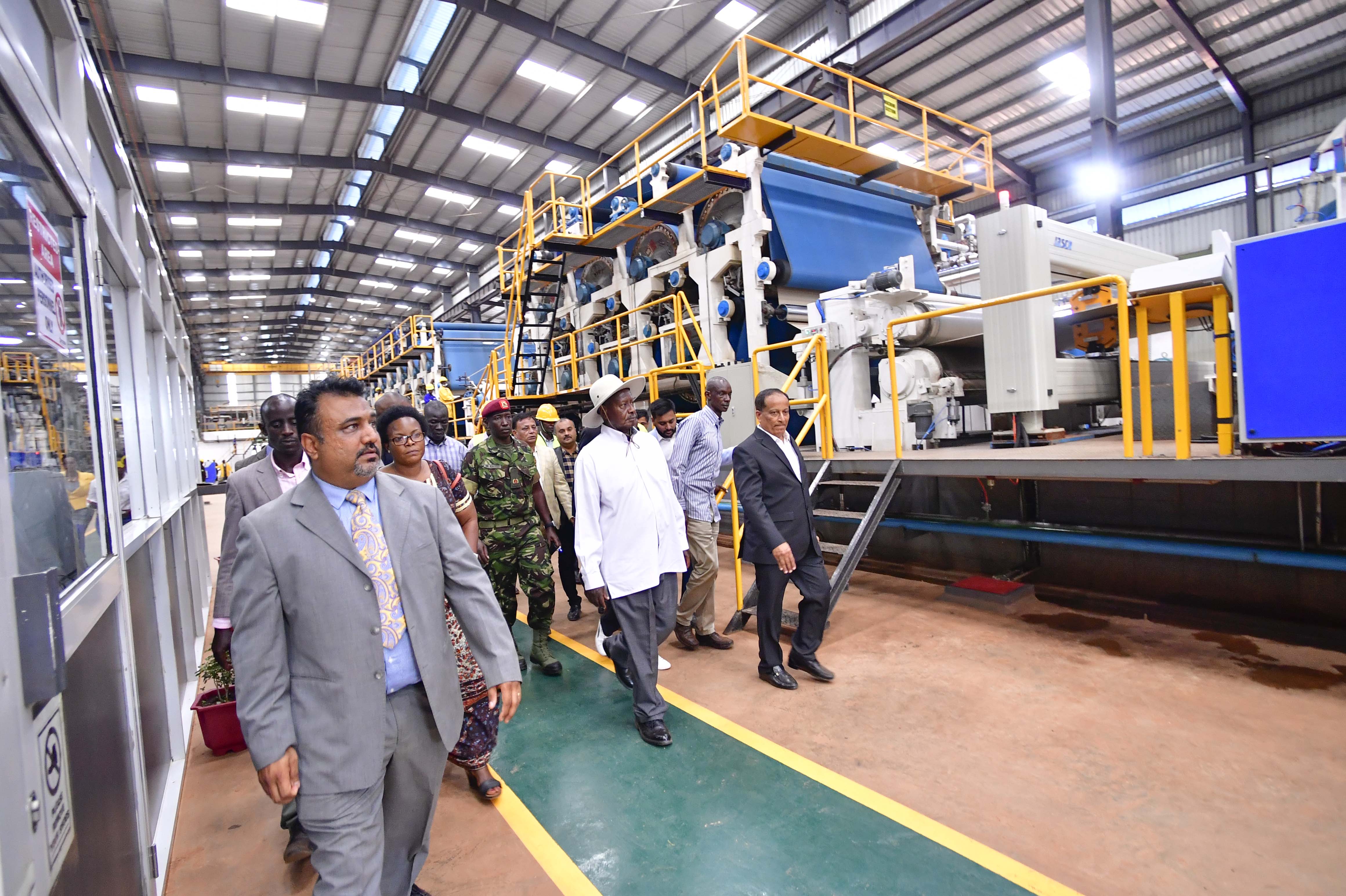 President Yoweri Museveni inspecting Modern Laminates Limited, in Jinja, before commissioning the factory in May 2019. President Museveni is a keen enthusiast of Uganda’s industrialization and value addition.