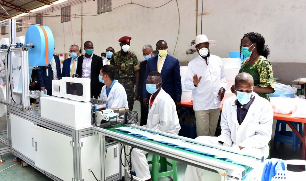 LEADING BY EXAMPLE: President Museveni (standing in white shirt) wears a mask during the recent launch of a mask-making plant in Kampala. Monsignor Cappo lauds President Museveni’s firm leadership in Uganda’s Covid-19 pandemic response especially his consistent emphasis on the critical need for individuals to protect themselves and their communities from Covid-19 by observing the set public health measures.