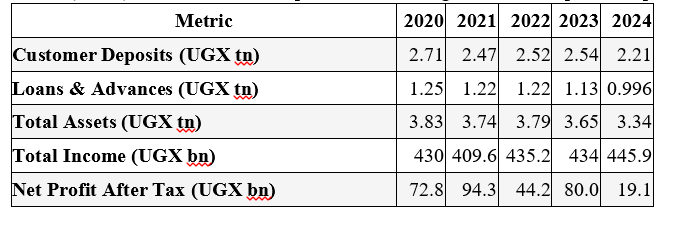Between 2020 and 2024, customer deposits declined from UGX 2.71 trillion to UGX 2.21 trillion (–19%), loans and advances from UGX 1.25 trillion to UGX 996 billion (–20%), and total assets from UGX 3.83 trillion to UGX 3.34 trillion (–13%).
