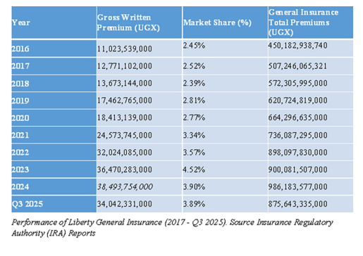 By Q3 2025, Liberty had already written UGX 34.04 billion in premiums, with 3.89% market share.