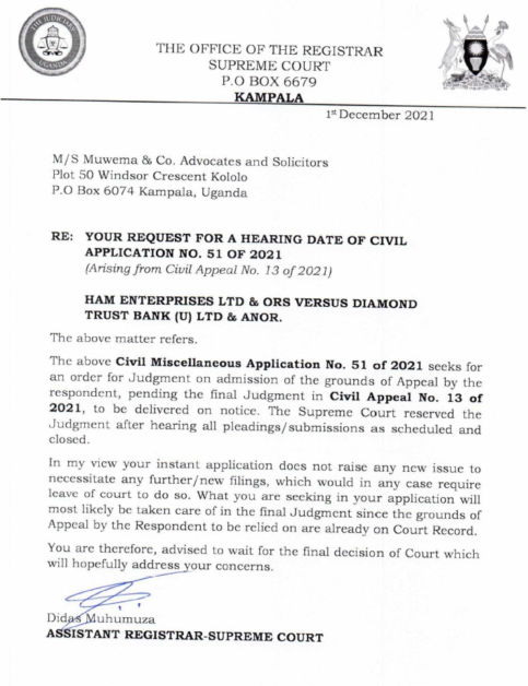 On November 26th 2021, vide letter MC/27/21/FM Muwema & Co Advocates, together with M/s Kimara Advocates & Consultants wrote to the Supreme Court seeking an order for judgement alleging that DTB Uganda and DTB Kenya had made an admission on some of the grounds on which Ham is appealing, which effectively would mean the appeal would be decided in his favour.