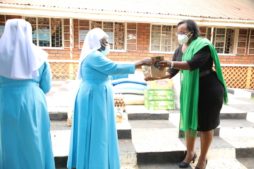 URSB Registrar General, Mercy Kainobwisho (R) hands over the donations to Sister Mary Lawrence Nakiwu, Administrator of the Bakateyamba Home for the Elderly