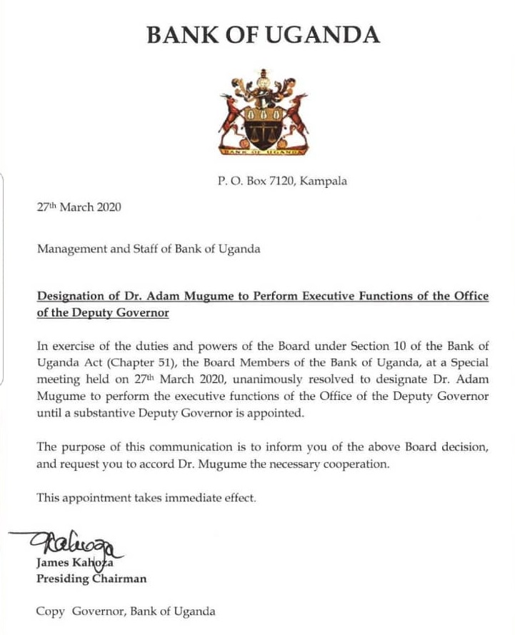 Dr. Mugume’s appointment follows the expiry of Dr. Louis Kasekende’s contract on January 14th, 2020 and the subsequent two-month vacuum as the President, who is the only constitutional appointing authority of the Governor and Deputy Governor, is yet to appoint a substantive Deputy Governor.